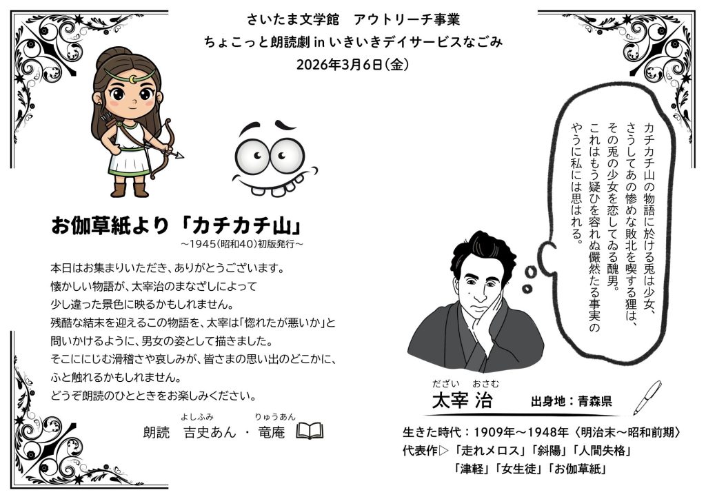 さいたま文学館のアウトリーチ事業として、デイサービスにて朗読劇を上演いたしました。