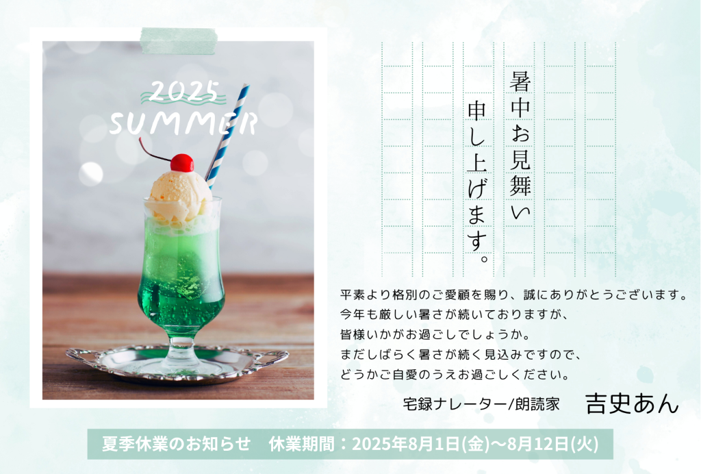 当方の音声提供サービスは、下記日程を夏季休業とさせていただきます。